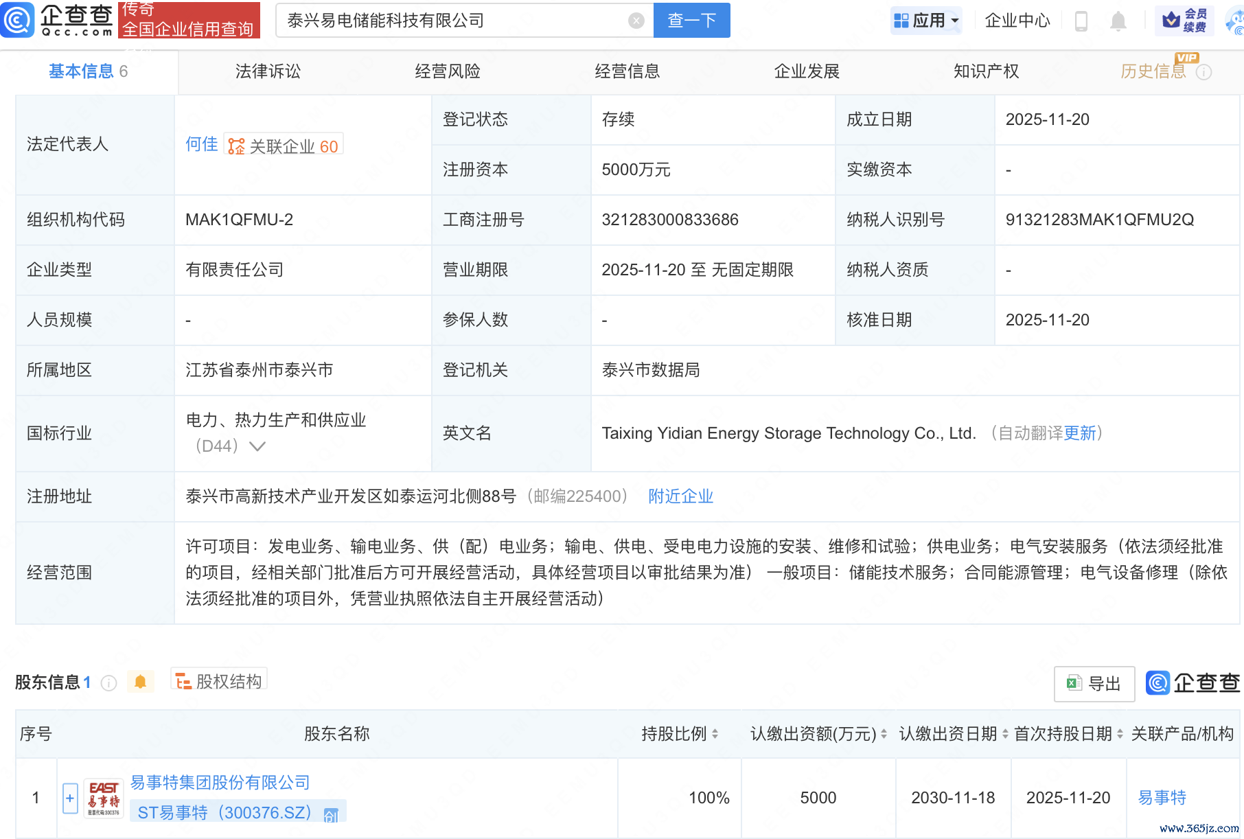 近日诚利和 ,泰兴易电储能科技有限公司成立,注册资本5000万元,经营范围包含:储能技术服务;合同能源管理;电气设备修理等。企查查股权穿透显示,该公司由ST易事特(300376)全资持股。
