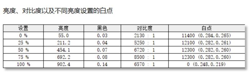 默认设置下,最高亮度909nits,白点色温12300,有些偏冷。