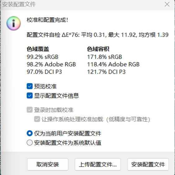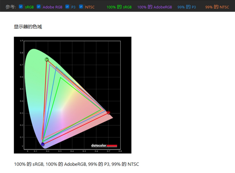 这是用红蜘蛛测试的色域覆盖,100%的sRGB色域、100%的aRGB色域、99%的DCI-P3色域以及 99%的NTSC色域覆盖。