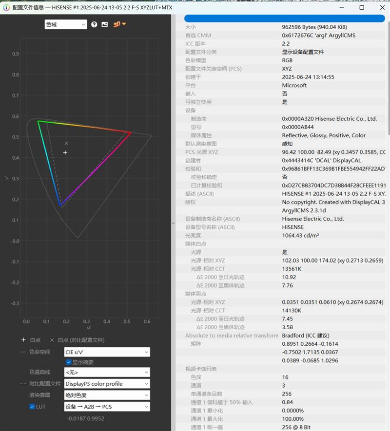 这是使用爱色丽i1 Display Pro HL测试的色域容积数据,详情如下:
