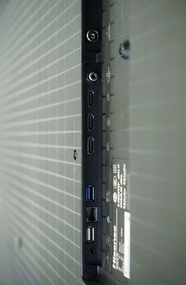 背部右侧有一排I/O接口,从上到下依次是:天线接口、同轴音频接口、3个HDMI 2.1接口(中间的支持eARC)、USB 3.0、有线网口、USB 2.0以及一个音频输入接口。