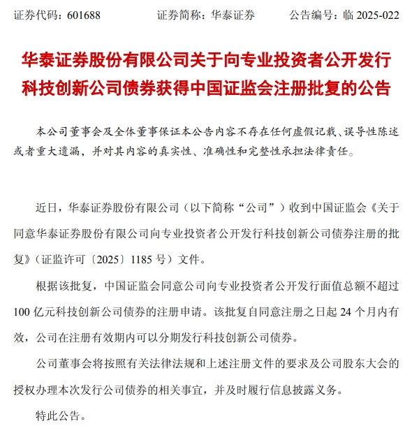 华泰证券16日公告,证监会同意公司向专业投资者公开发行面值总额不超过100亿元科技创新公司债券的注册申请。