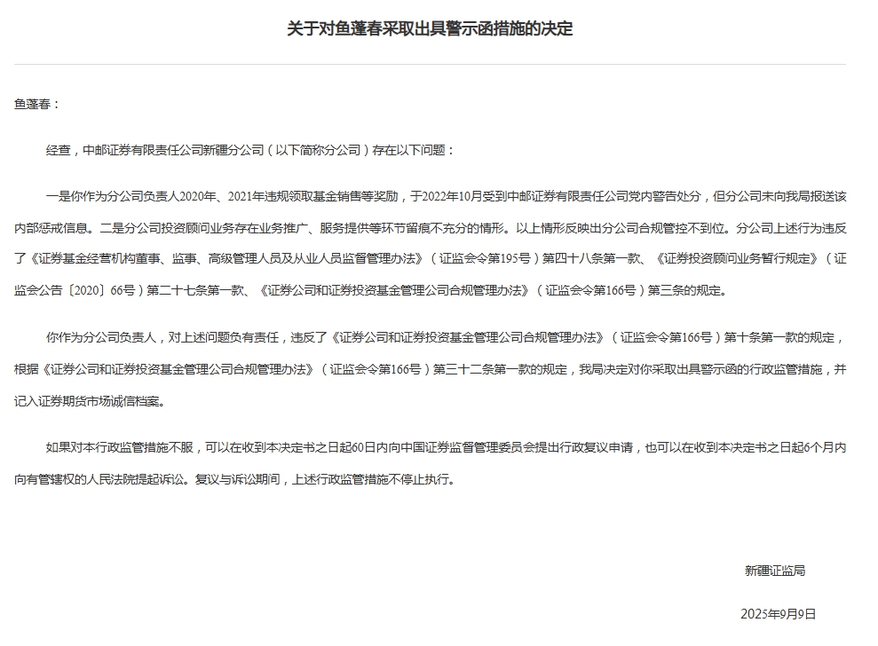 新疆证监局称,鱼蓬春作为中邮证券新疆分公司负责人2020年、2021年违规领取基金销售等奖励,于2022年10月受到中邮证券有限责任公司党内警告处分,但分公司未向我局报送该内部惩戒信息。分公司投资顾问业务存在业务推广、服务提供等环节留痕不充分的情形。以上情形反映出分公司合规管控不到位。