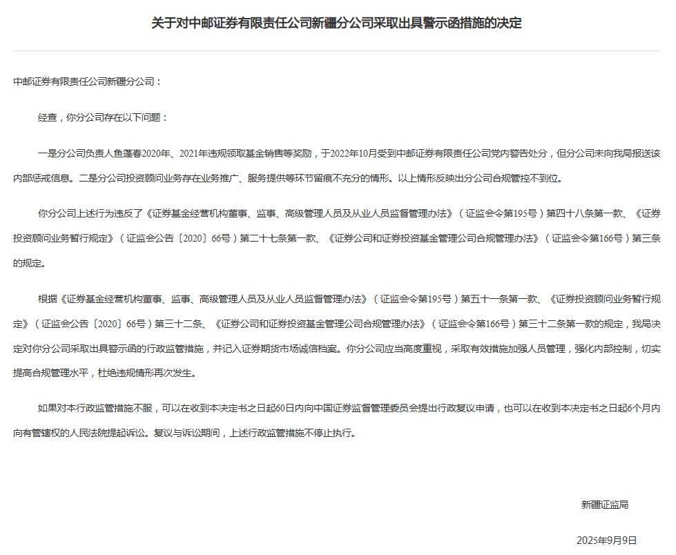 根据《证券基金经营机构董事、监事、高级管理人员及从业人员监督管理办法》等规定,新疆证监局决定对中邮证券新疆分公司采取出具警示函的行政监管措施,并记入证券期货市场诚信档案。