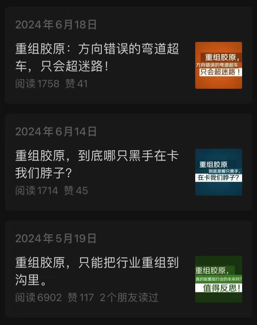 (“大嘴博士”多次发文质疑重组胶原蛋白,来源:大嘴博士微信公众号)