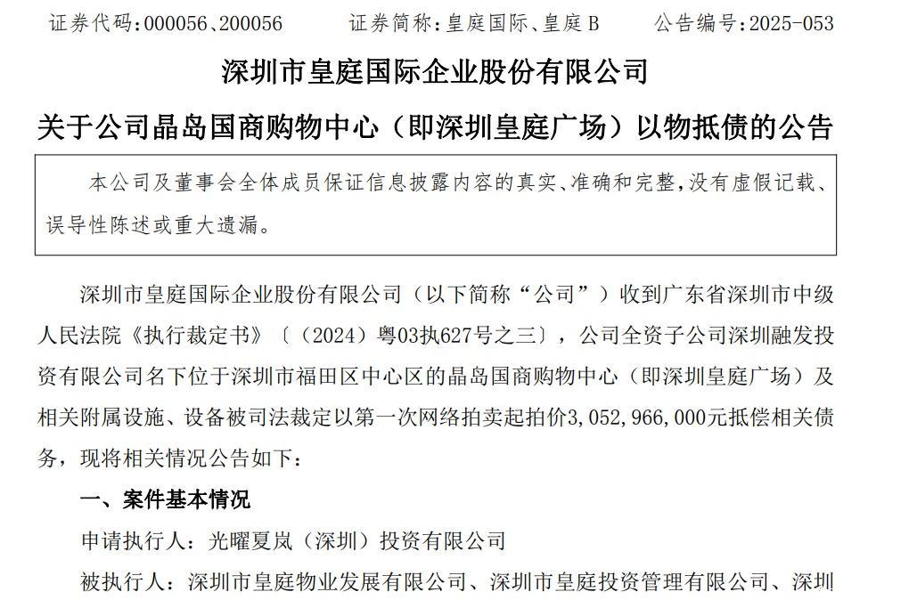 10月8日,皇庭国际一纸公告宣告其核心资产命运尘埃落定,公司全资子公司深圳融发投资有限公司(下称“融发投资”)名下的晶岛国商购物中心(即深圳皇庭广场)被深圳市中级人民法院裁定以30.53亿元抵偿债务,这一价格与9月流拍的首次法拍起拍价持平,意味着这座运营12年的商业地标正式易主。