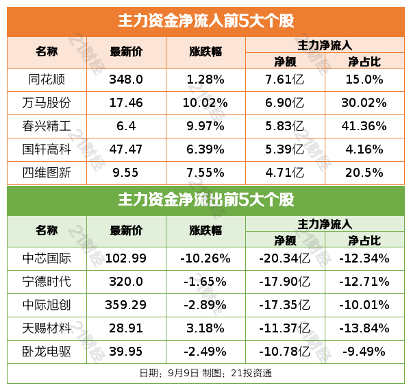 机构点睛中信建投:储能增长的核心逻辑是新能源渗透率提升和储能系统成本下降的共振。目前国内储能市场需求强劲,锂电池排产旺盛,储能电池出现涨价迹象;5.31后淡季不淡,项目招标高增。原因主要可分为两点,一是多省推出容量补偿、容量租赁等政策提升储能项目收益确定性;二是新能源全面入市背景下峰谷价差拉大。目前山东等省市场化程度高,储能电站经济性好;蒙西限电较为严重,配储比例有很大提升空间。海外来看,欧洲、澳洲、拉美、东南亚等地需求良好。华泰证券:近期景气筑底或爬坡的行业逐渐增多,主要包括:1)AI产业周期驱动下的通信设备、存储、软件、游戏;2)“反内卷”政策受益或自身有涨价逻辑的煤炭、有色、部分化工品(纯碱/农化)、钢铁、新能源等景气回升;3)独立景气周期、且有一定持续性的,通用设备、航空装备、医药、保险;4)工程机械、大众消费品等部分顺周期品种景气亦有企稳回升迹象。配置上,AI、医药、“反内卷”、大金融等前期主线中内部高切低,左侧布局受益于人民币升值、基本面有改善预期、估值和筹码处于相对低位的消费、电新等,建议关注创新药、存储、软件、有色、化工、工程机械、保险、电池/光伏等。焦点公告太极集团:子公司获司美格鲁肽注射液药物临床试验批准通知书2连板泰坦股份:公司新设子公司从事固态电池锂硫磷氯电解质研发和生产,尚未形成产业化和销售收入矩阵股份:全资子公司暗壳科技引入战略投资者集福基金7天5板西部黄金:股东金源公司9月8日至9月9日减持1%公司股份,减持计划实施完毕博苑股份:碘化物产品暂未在固态电池领域实现销售均胜电子:机器人相关零部件业务尚处于前期起步阶段,营业收入占比不到0.1%三博脑科:拟以5700万元认购基金份额,该基金主要投资于脑科学领域居然智家:公司实际控制人由汪林朋变更为杨芳资金雷达行业资金流