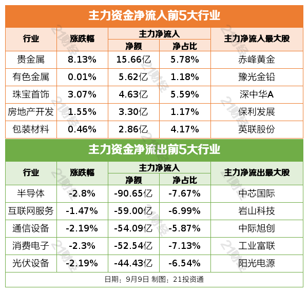 昨日A股9月9日,市场全天震荡调整,三大指数集体收跌。截至收盘,沪指跌0.51%,深成指跌1.23%,创业板指跌2.23%。沪深两市成交额2.12万亿,较上一个交易日缩量3002亿。盘面上,市场热点较为杂乱,个股跌多涨少,两市超4000只个股下跌。板块方面,黄金、地产、银行等板块涨幅居前,半导体、消费电子、医疗服务等板块跌幅居前。